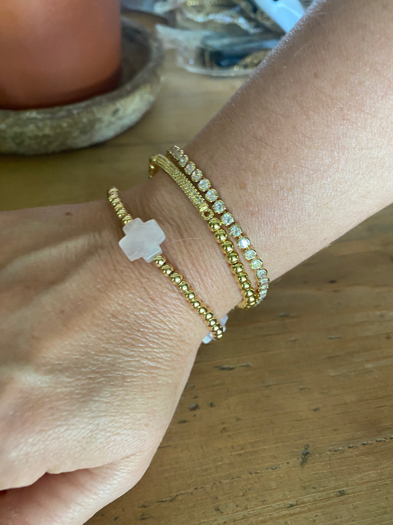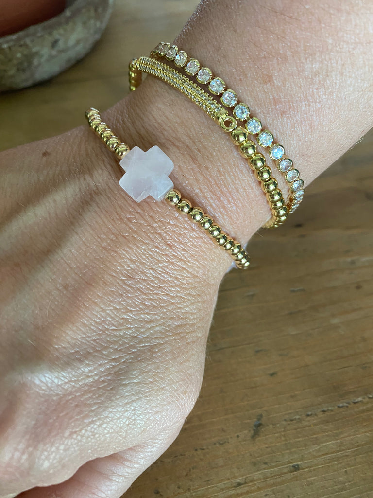Add a touch of whimsy to your stack with our Rose Quartz Cross Bracelet! The gold beads and rose quartz stone cross detail make for a unique and playful addition to any outfit. Perfect for those who love to mix and match their accessories. (Stacking encouraged!)