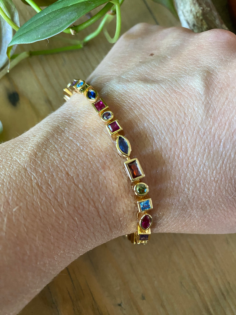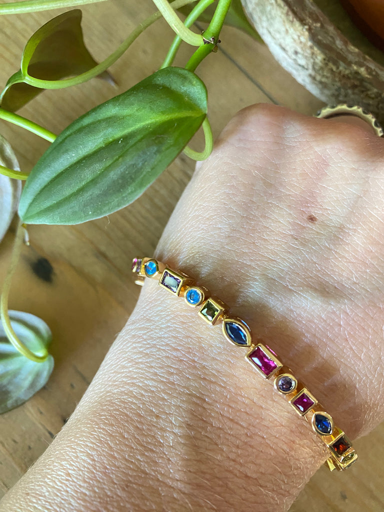 Add a pop of color to your style with our Rainbow Jewel Bracelet! Designed with multi colored stones, this stainless steel bracelet is perfect for stacking. Brighten up any outfit and let your personality shine with this playful and quirky accessory! (Bracelet stacking never looked so good!)