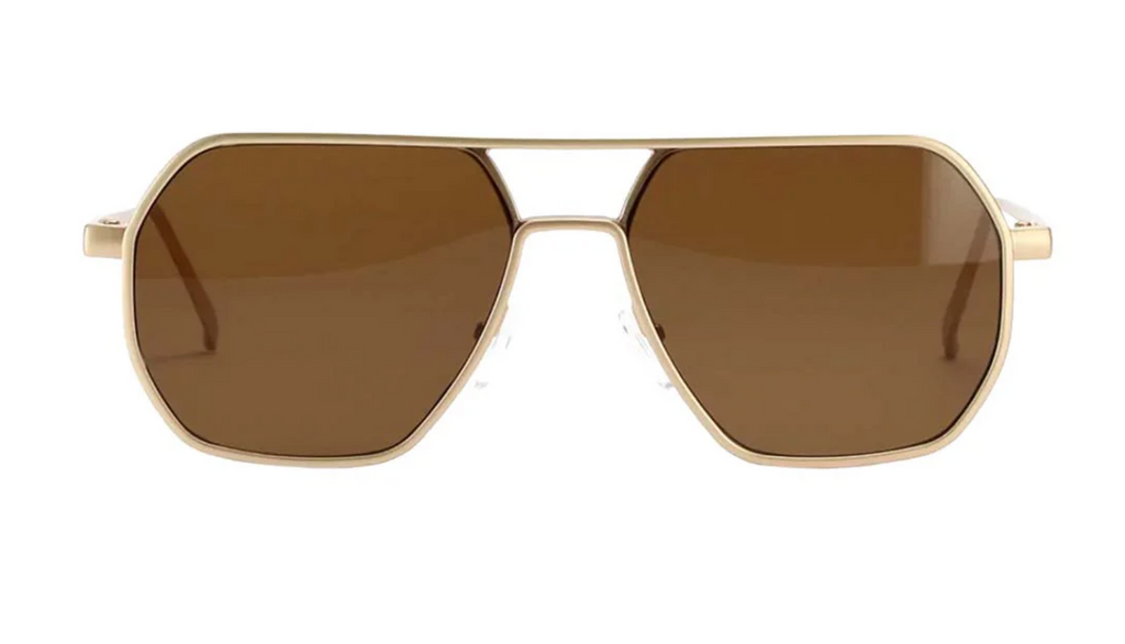 Nola Polarized Sunglasses feature a unisex double-bridge aviator metal frame for timeless appeal and adjustable nose pads ensuring all-day comfort. Available in black/gold, brown/gold, green/gold, and black/black.