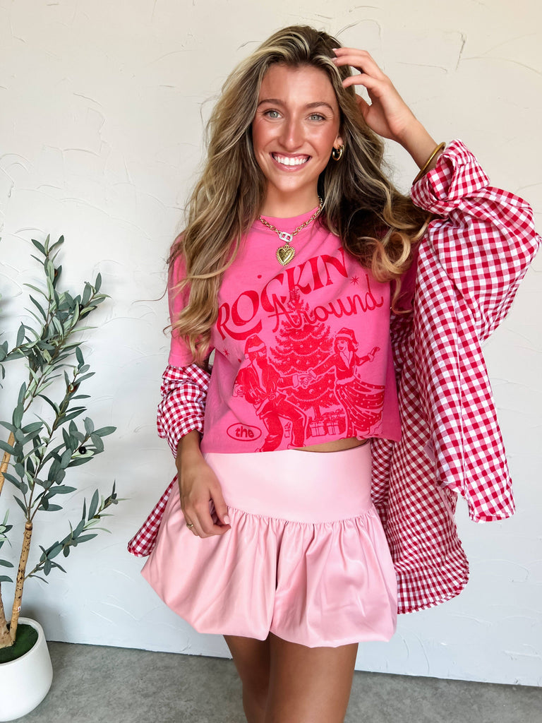 The tee that brings the party to Christmas. Bright, bold, and full of retro cheer — this “Rockin’ Around the Christmas Tree” graphic tee is made for every holiday moment, from cookie swaps to tree decorating dance breaks.
